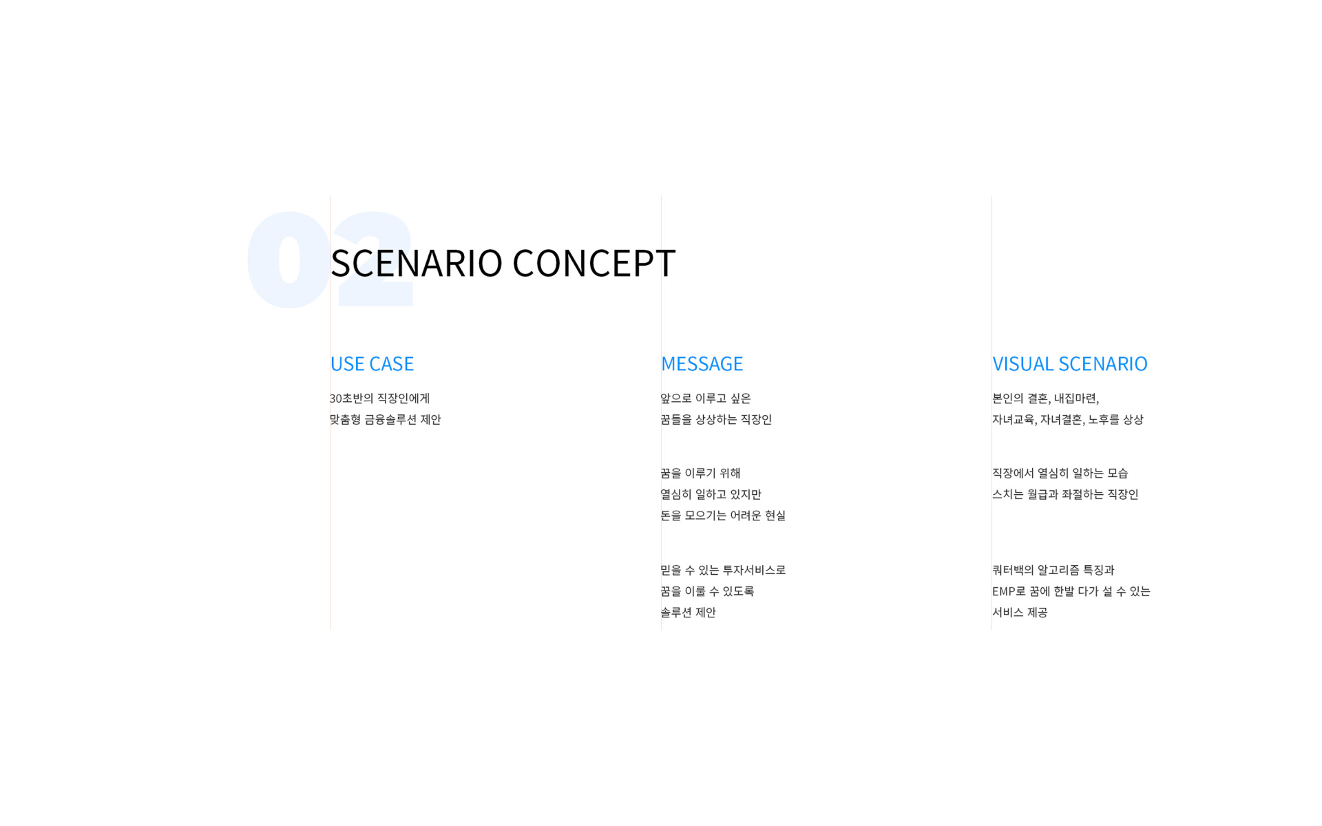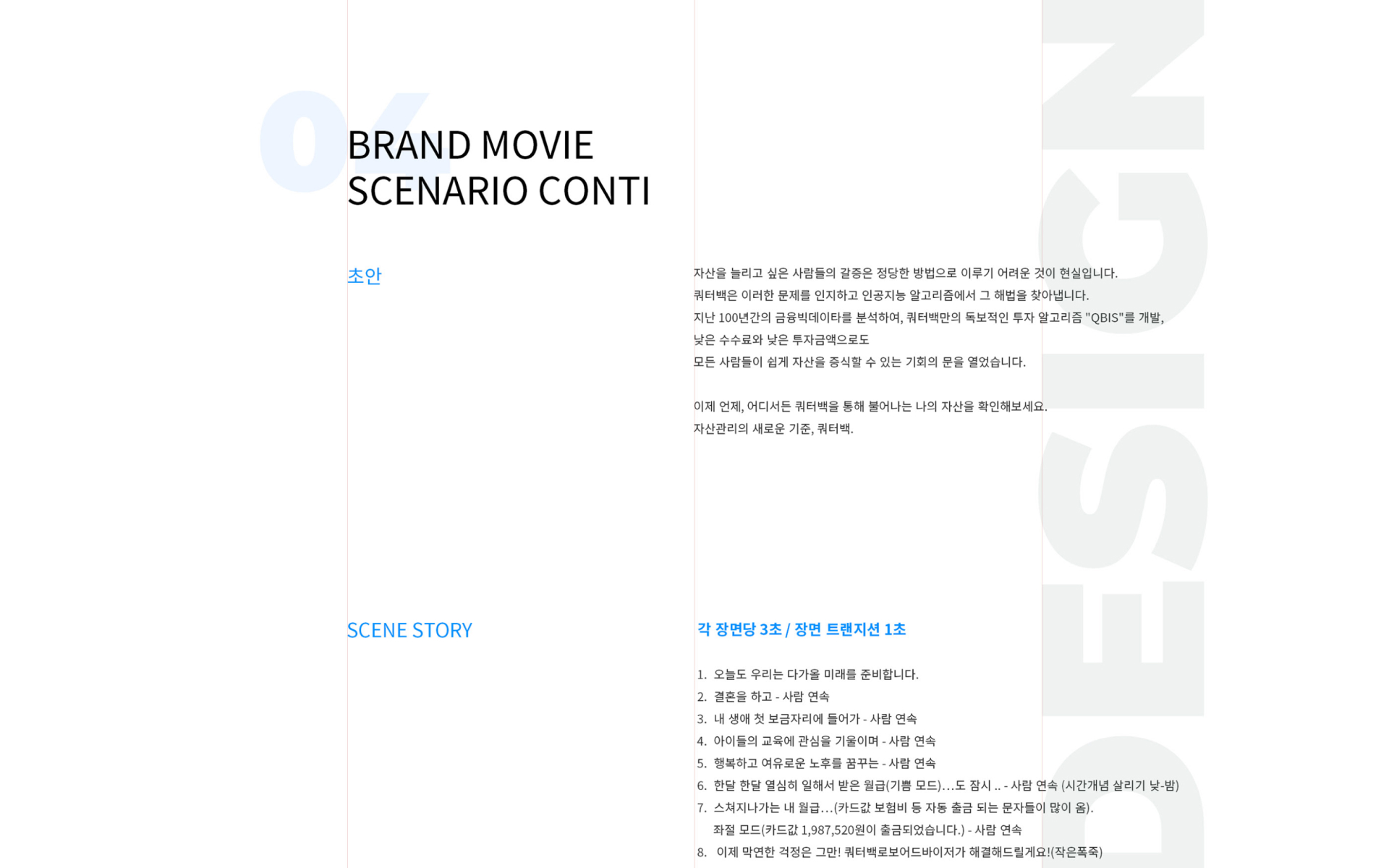 쿼터백자산운용의 주력 서비스인 로보어드바이저 브랜드 스토리 영상. 직장인에 맞춤형 금융케어 솔루션을 제공하는 시나리오를 인포그래픽 영상으로 브랜드 스토리텔링형식으로 제작하였다.