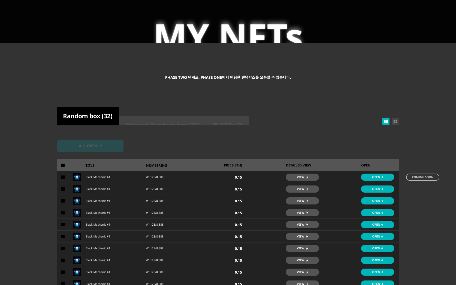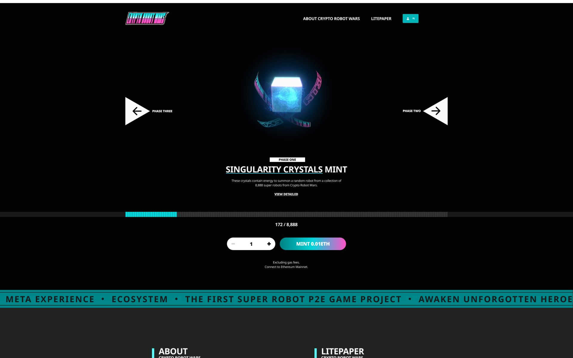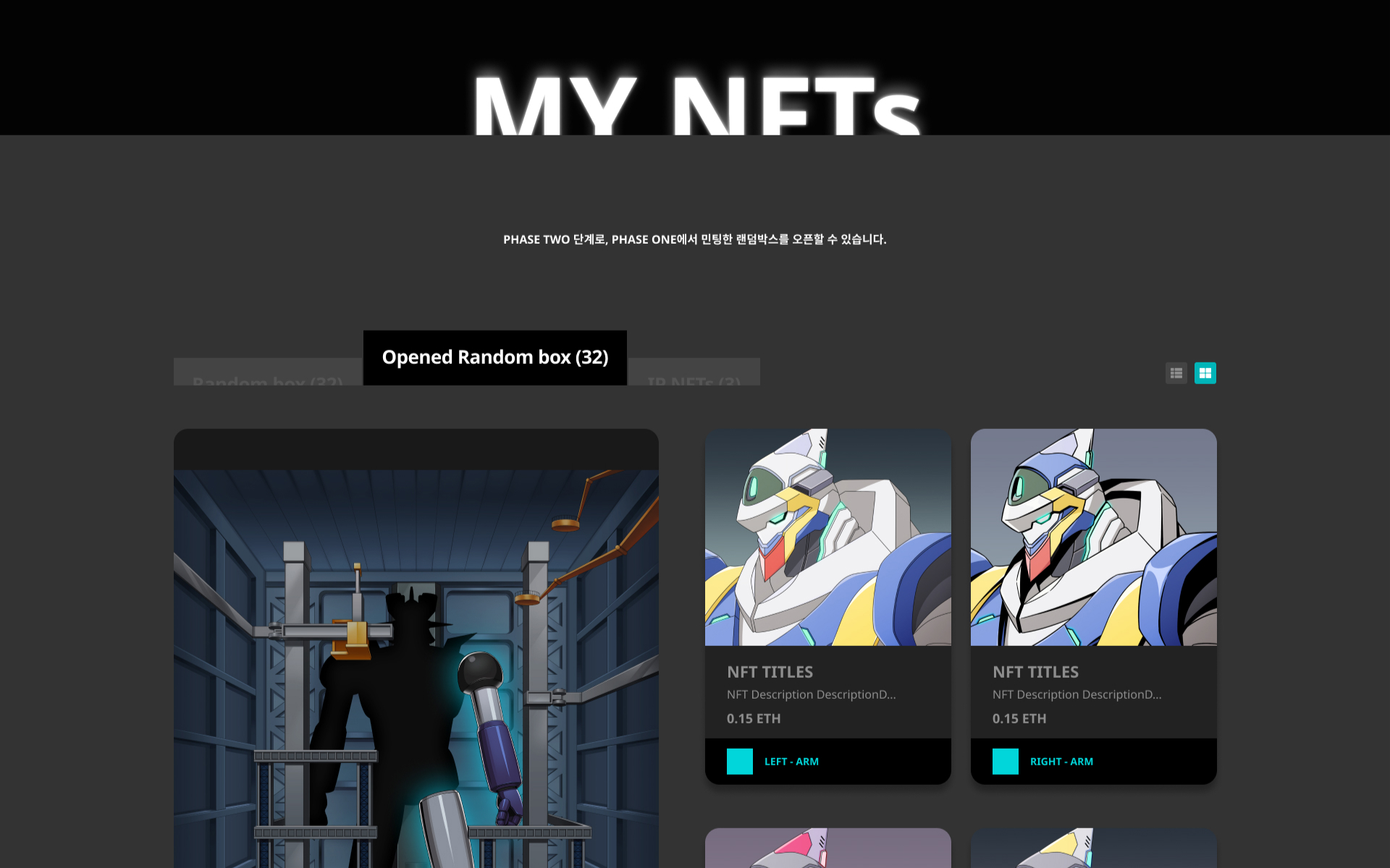 크립토코인의 민팅사이트로, 소정의 비용으로 랜덤박스를 구매할 수 있도록 개발. 히어로존에 강렬한 인상의 랜덤박스를 배치하고, 실시간 민팅현황을 볼 수 있도록 직관적인 UX를 적용. 컨셉에 맞게 폰트, 색상, 이미지로 스토리를 하나의 페이지에 효과적으로 표현하였다.
