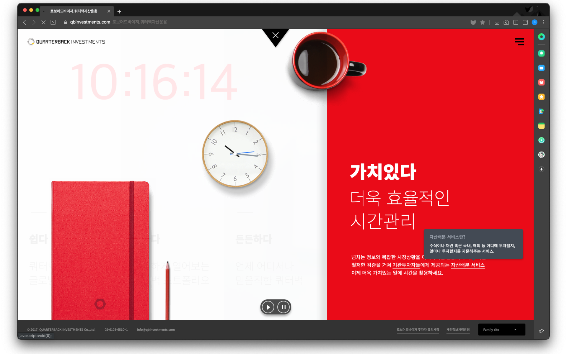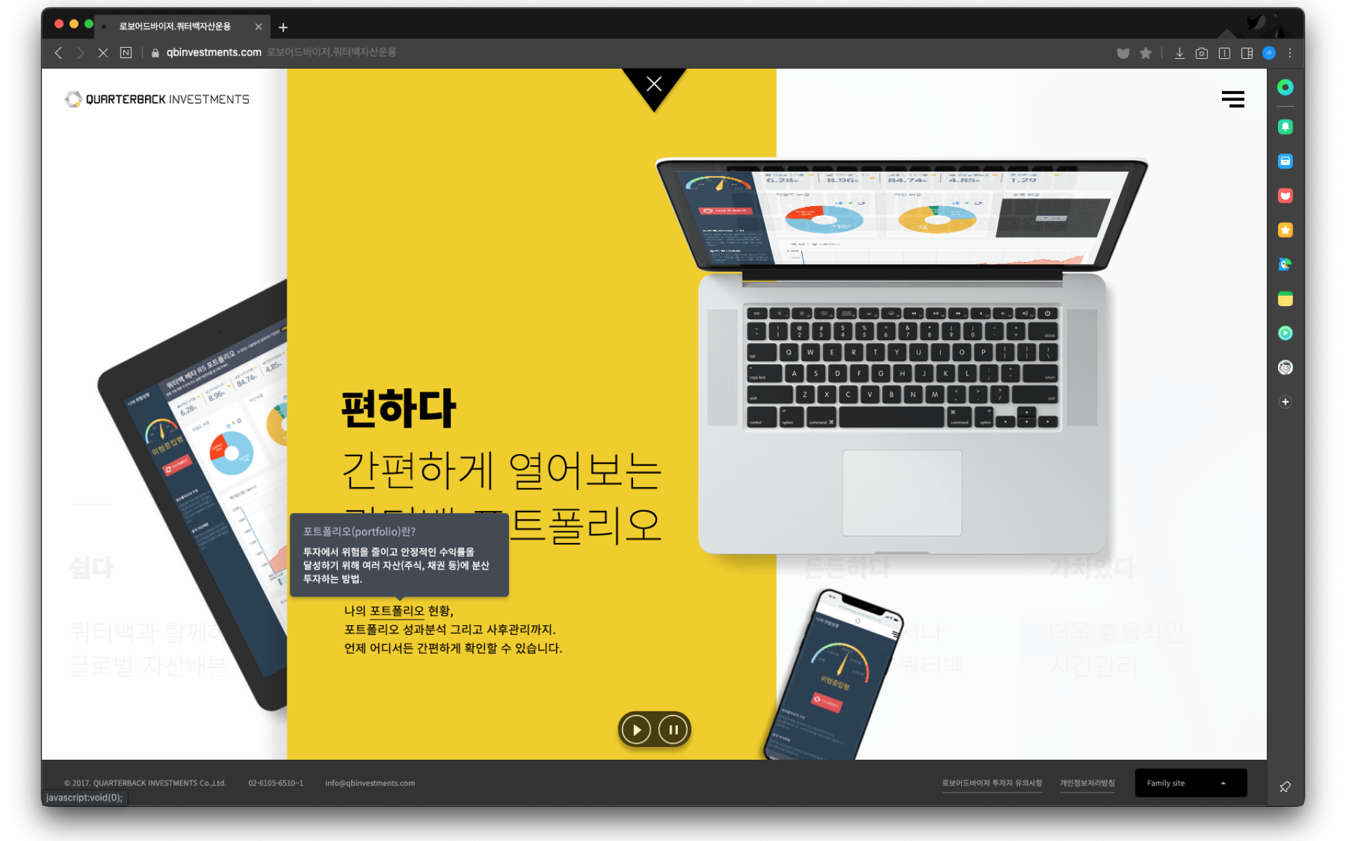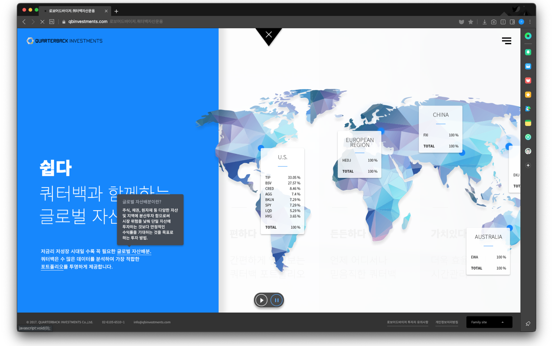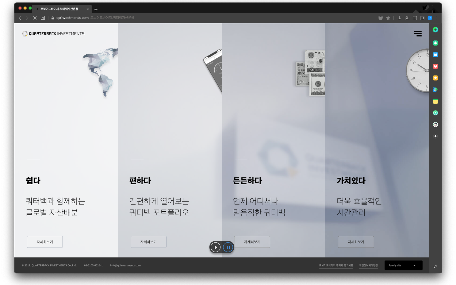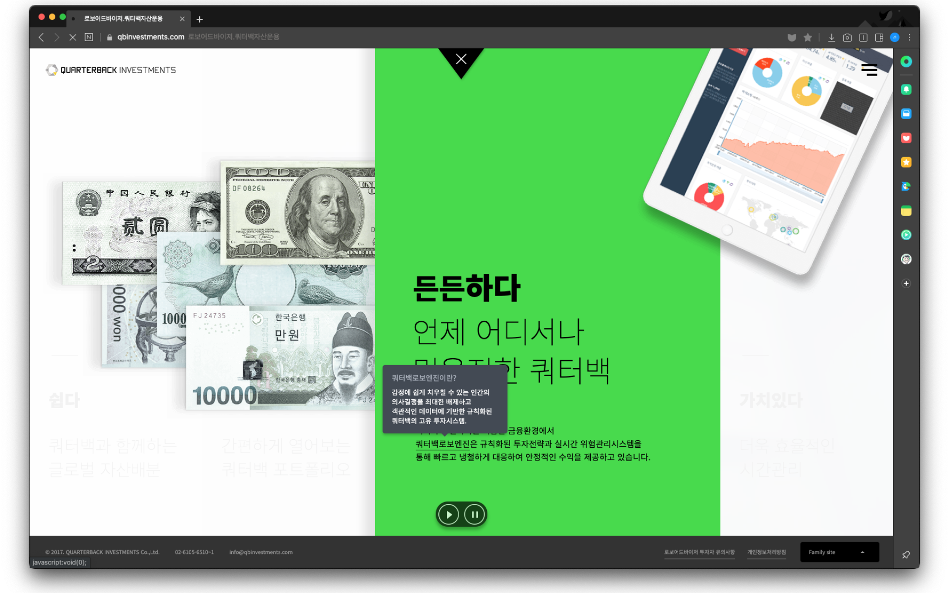 쿼터백자산운용의 주력서비스인 로보어드바이저를 쉽고, 편하고, 든든하고, 가치있는 4개의 핵심가치로 표현하고 각 섹션별로 풍부한 에니메이션효과를 적용해 홈페이지 리뉴얼 프로젝트를 수행하였다. KIPFA(한국인터넷전문가협회) 주최 webawardkorea2017 금융자산관리 부문 대상을 수상했다.